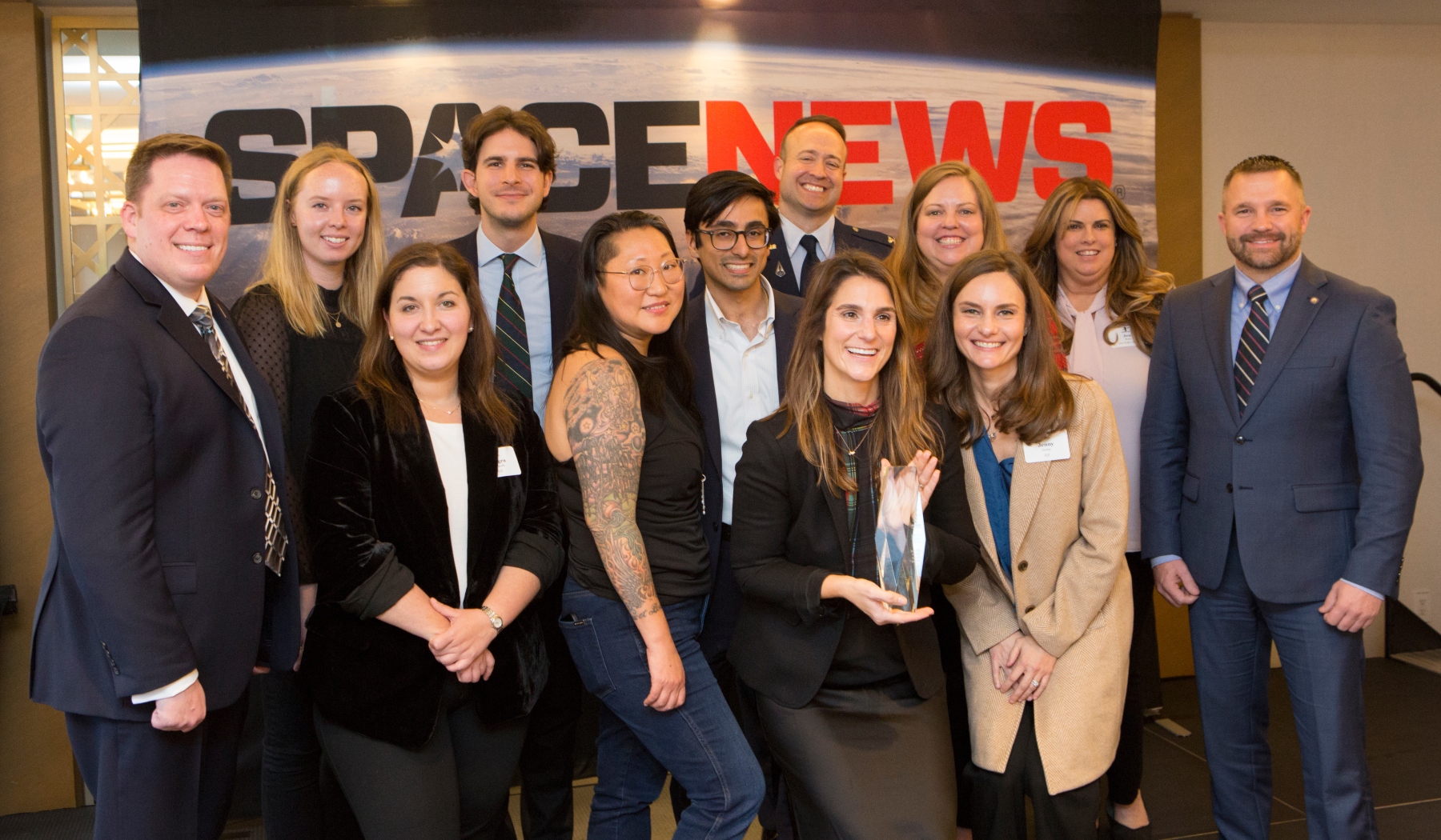 From left to right the awards winners were: Military Space Organization of the Year – Space Systems Command’s Commercial Space Office (COMSO) represented by U.S. Space Force Col. Richard Kniseley; Space Stewardship Award – T.S. Kelso, Mark Skinner, Aerospace Corporation accepted for for TS Kelso; Civil Space Achievement of the Year – OSIRIS-REx Sample Return Mission, Rich Burns, NASA Goddard accepted for Dante Lauretta; Unsung HeroUtah State University’s Small Satellite Conference represented by Pat Patterson, Chair of the Small Satellite Conference and Director of Advanced Concepts at Utah State University’s (USU) Space Dynamics Laboratory (SDL); Startup of the Year – Isar Aerospace represented by CCO Stella Guillen; Deal of the Year – Eutelsat-OneWeb Merger represented by Kevin Steen, CEO OneWeb Technologies.